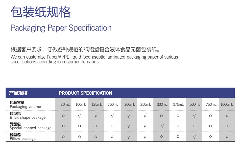Aseptic Laminated Packaging Paper has good barrier property and keeps light away. The package is most commonly used to store milk, juice, and beverage, etc. original flavor for 6-12 months under normal temperature. It can be used for aseptic brick-shape filling machines domestic and abroad.